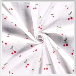 Summary: Cute cherry design on white cotton Lightweight, breathable muslin double gauze 130cm wide for versatile sewing projects Ideal for summer wear, baby items, and home décor Soft and gentle – perfect for sensitive skin