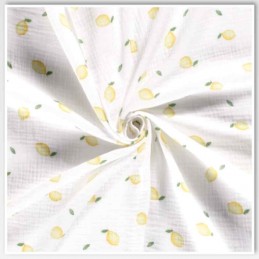 Summary: Cheerful lemon print on lightweight muslin gauze 100% cotton, breathable, and soft to the touch 130cm wide, perfect for garments and crafts Ideal for babywear, summer clothes, swaddles, kitchen linens Easy to cut, sew, and care for