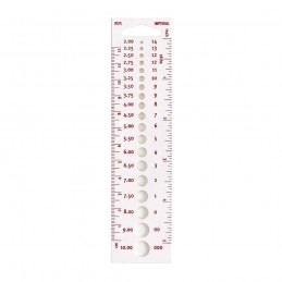 The Pony Knitting Needle Gauge / Sizer is a handy tool designed for knitters to quickly and accurately measure their knitting needles. This plastic gauge features multiple holes marked with needle sizes in metric (mm), imperial (inch), and U.S. sizing, allowing you to identify any needle size by simply inserting the needle into the corresponding hole. In addition, it includes a ruler on both sides, marked in centimetres and inches, to help with measuring knitting samples or gauge swatches. Compact and lightweight, this gauge is an essential accessory for any knitting enthusiast seeking precision in their projects.
