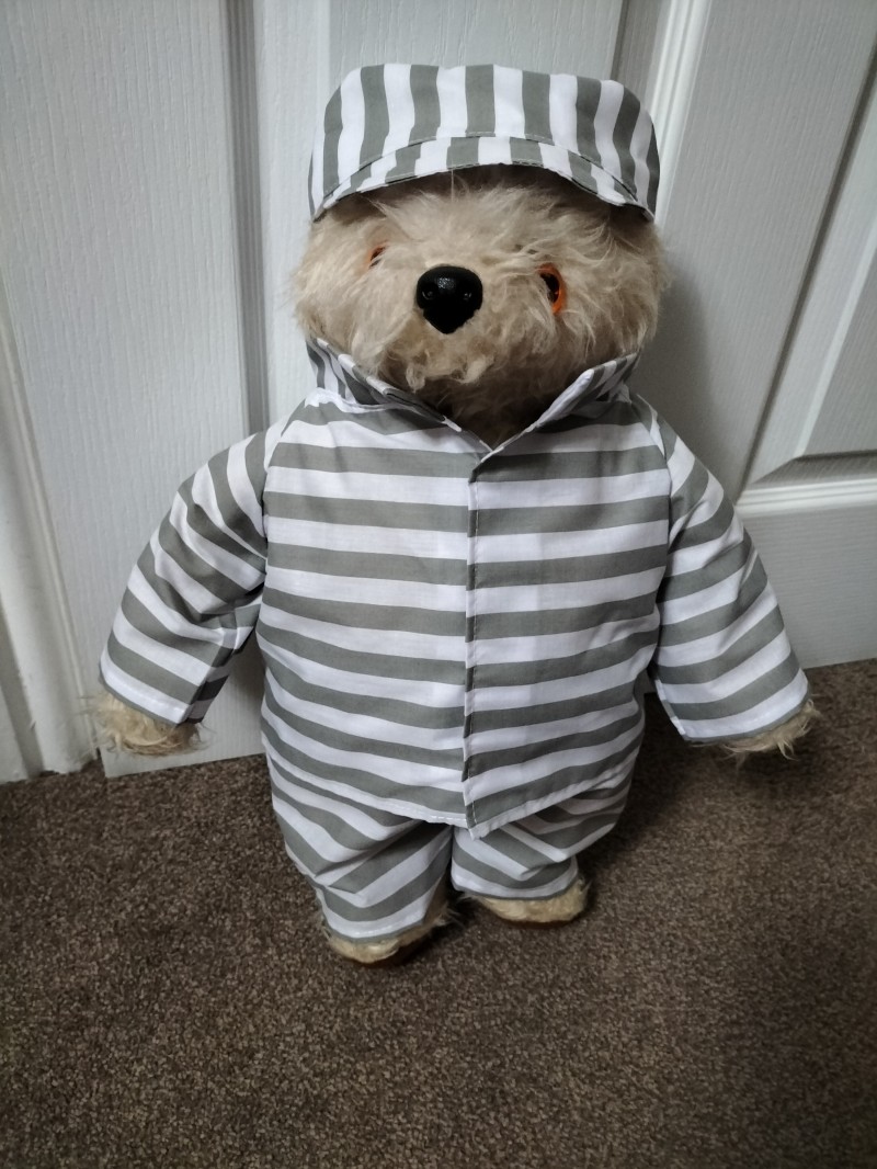 I love this stripe fabric. I make clothes for Paddington bears and after the second movie couldn't resist making a little jail outfit for him. This is the best match I have found as no one sells pink and grey striped material and I haven't plucked up the courage to try adding pink dye. The outfit is therefore pre red sock wash for anyone who has seen the film.