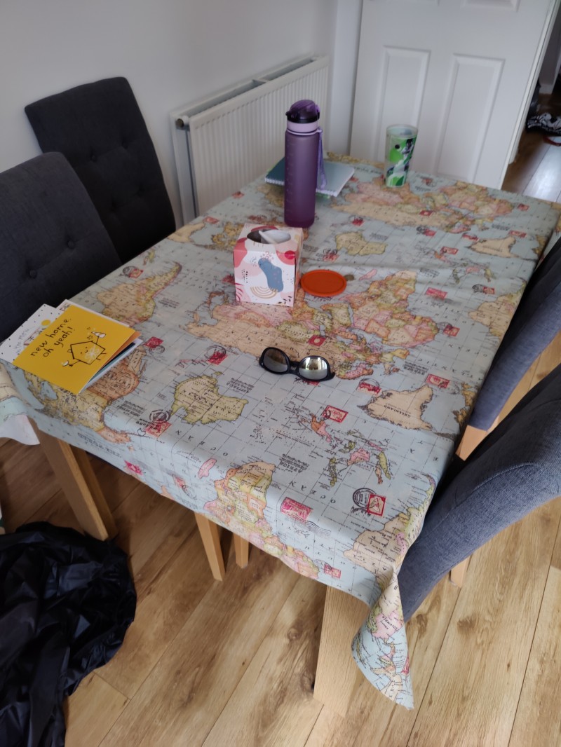 Used as a table cloth and looks great - doesn't stand out too much in the room but definitely adds something a little different. The tiling of the map puts places next to each other that shouldn't be (eg Mexico next to Europe) so don't get this if you're wanting an exact map, but it works great for us and love the pattern.