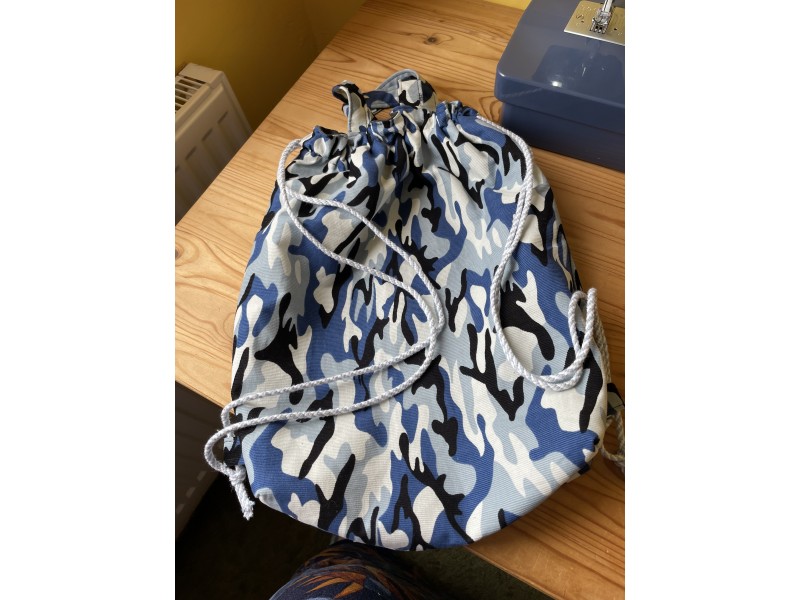 Picture is a drawstring bag made with the camouflage blue corduroy I bought