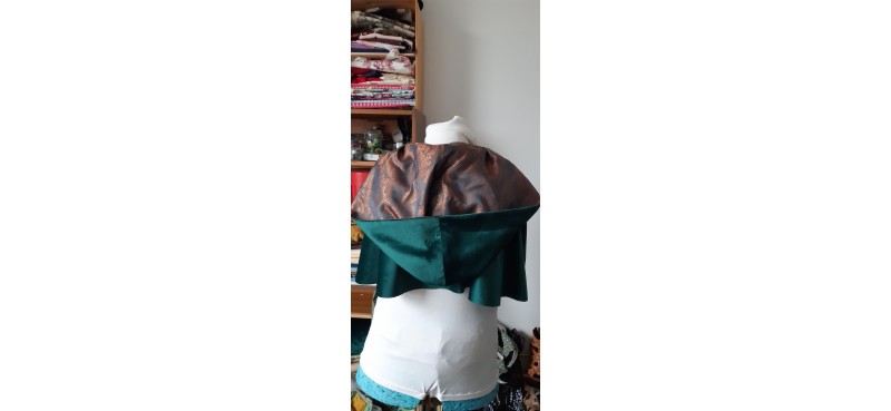 So decided to make a short velvet cape with hood to match the dress. Alas looking everywhere the linings were so boring and plain. With a large hood on display to the wedding guests, it needed to have that wow factor. The colours for the wedding venue are green and bronze I couldnt believe the Paisley lining was in those same colours.