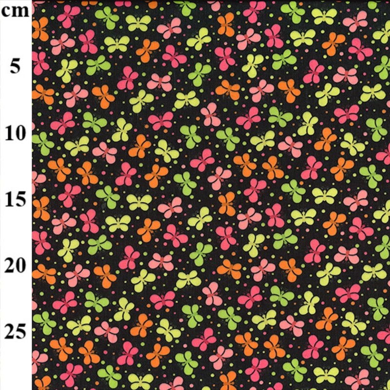 Brighten up your sewing projects with this Butterflies on Black Polycotton Fabric. Featuring neon pink, orange, and green butterflies with matching polka dots scattered across a deep black background, this playful design is perfect for both children’s and adult projects alike.
