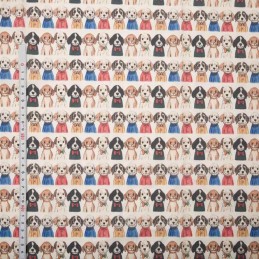 Add a lovable touch to your sewing projects with this Digital Polycotton Dogs fabric, showcasing rows of cute puppies dressed in bow ties, jackets, and playful accessories. Printed on a white background, the digital process ensures sharp details and vibrant colours, making this design irresistibly charming.