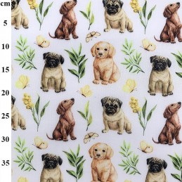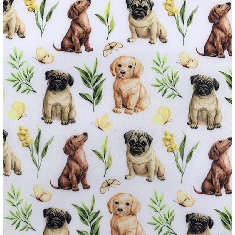 This charming puppy dog polycotton fabric features beautifully illustrated dogs including pugs, dachshunds and labrador puppies, surrounded by delicate leaves and butterflies. Set on a light background, the design has a soft, natural feel that is perfect for both children’s and pet-themed sewing projects.