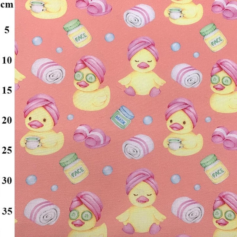 Add a splash of fun to your sewing projects with this adorable spa ducks polycotton fabric. Featuring cute rubber ducks enjoying a pamper day with towels, face masks, cucumbers and bubbles, this quirky and cheerful design is perfect for light-hearted creations.