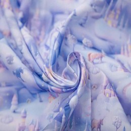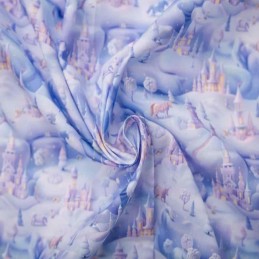 Transform your sewing projects with the enchanting Digital Polycotton 3D Winter Wonderland fabric. This magical design features pastel castles, snowy landscapes, and mystical unicorns, digitally printed in soft purple tones for a dreamy winter look.