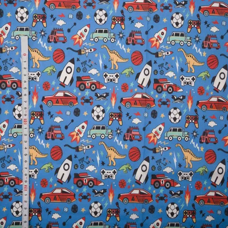 Add colour and excitement to your sewing with the Digital Polycotton Playtime fabric. Featuring a lively design of cars, rockets, dinosaurs, sports balls, and gaming controllers, this fabric is full of energy and imagination—perfect for kids who love action and play.