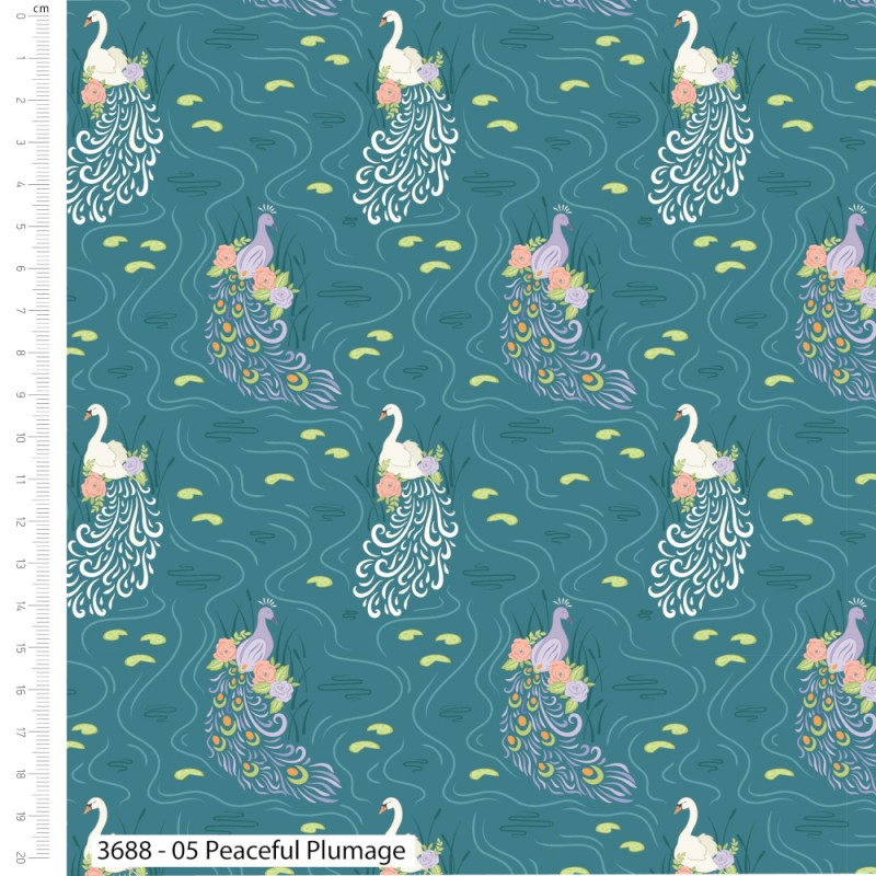 The Peaceful Plumage fabric from the Austen’s Library collection by Craft Cotton Co captures the elegance of water birds in a serene, timeless setting. The design features swans and other graceful birds gliding across rippling water, accented with lily pads, evoking a tranquil Georgian-inspired scene.