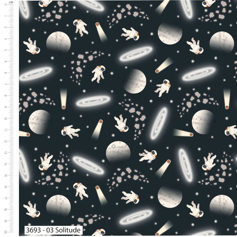The Solitude fabric from the Cosmic Voyager collection by Craft Cotton Co captures the stillness and wonder of space. The print depicts astronauts floating amongst asteroid fields, planets, and galaxies, creating a design full of cosmic mystery and depth.