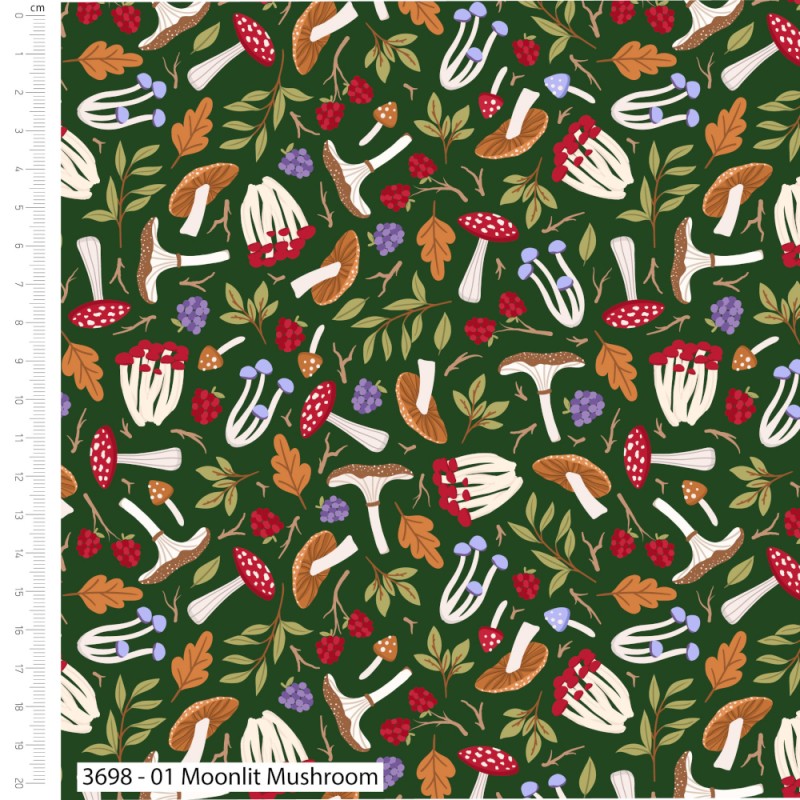 Moonlit Mushroom is part of the Nightfall Forest collection by Craft Cotton Co. This woodland-inspired fabric features a delightful print of mushrooms, toadstools, leafy twigs, and raspberries, all set against a rich green background. Perfectly capturing the beauty of an autumn forest, it brings a touch of seasonal charm to your sewing projects.