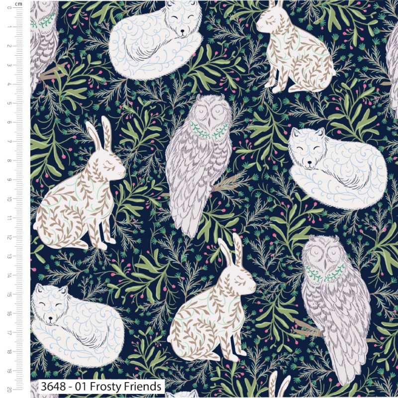 Frosty Friends is part of the Arctic Animals collection, designed by Bethany Salt for Craft Cotton Co. This charming print features white woodland animals including rabbits, owls and foxes, nestled among green foliage, all set against a deep navy background. The whimsical design adds a magical touch, making it a great choice for seasonal and nature-inspired sewing.