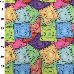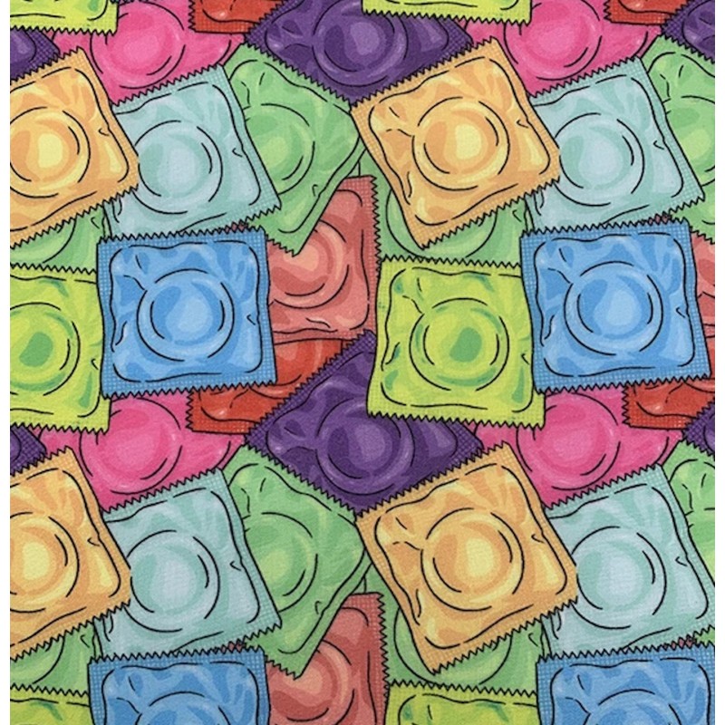 Make a bold and playful statement with this colourful novelty polycotton fabric featuring a vibrant condom print design. With bright overlapping colours and a fun, eye-catching style, this fabric is perfect for unique sewing projects that stand out from the crowd.
