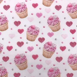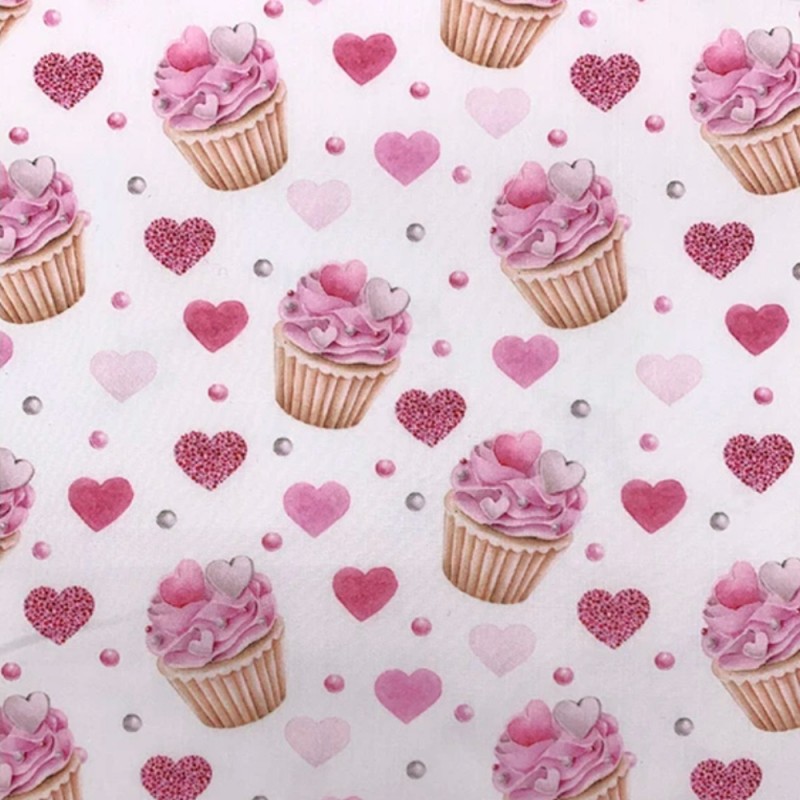 Add a touch of sweetness to your sewing projects with this charming Cupcake Hearts polycotton fabric. Featuring beautifully illustrated pink frosted cupcakes decorated with hearts, surrounded by scattered love hearts and delicate dots, this playful design is perfect for fun and creative makes.