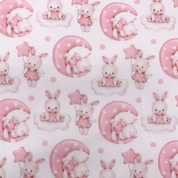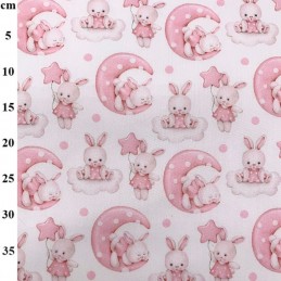 Create beautifully soft and dreamy projects with this adorable Sleeping Bunny Moon polycotton fabric. Featuring cute bunnies resting on fluffy clouds and crescent moons, alongside stars and gentle polka dots, this design captures a calming bedtime theme perfect for nurseries and children’s items.