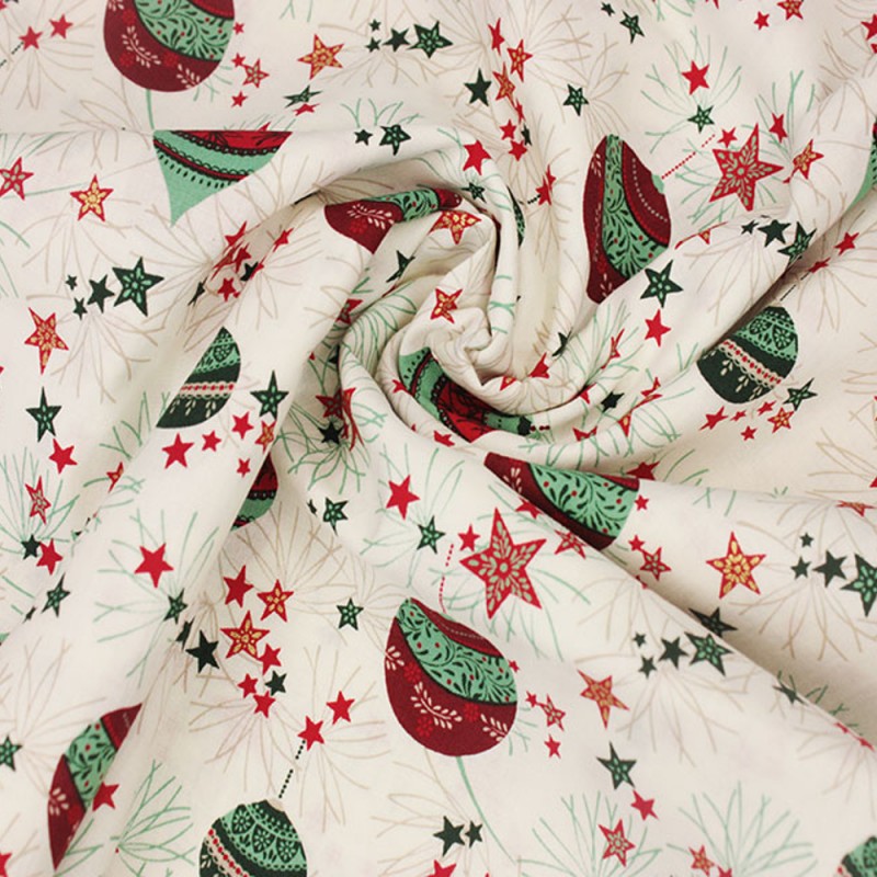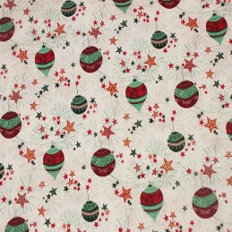 Summary 100% cotton woven fabric with delicate silver-grey bauble print Width approx. 110 cm (43 inches) Medium-weight (130–140 gsm) – ideal for quilting, crafts, and home décor Perfect for Christmas quilts, stockings, table runners, and gift bags Soft white background with patterned baubles and bows in subtle tones Oeko-Tex Standard 100...