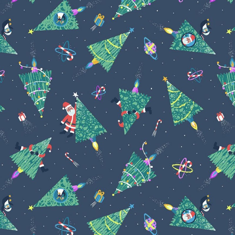 Don’t Clause a Scene is a playful festive design from the DON'T CLAUSE A SCENE collection by Dear Stella. It features a charming Christmas in space scene, with Christmas trees transformed into rockets, soaring among Santas, penguins, candy canes, presents and stars, all set against a rich navy background.