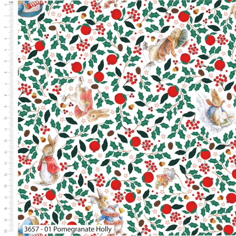 Pomegranate Holly is part of the Christmas Orchard collection from Craft Cotton Co, inspired by the timeless Beatrix Potter stories. This festive fabric features Peter Rabbit and other beloved rabbit characters, combined with pomegranates, holly, stars, and acorns, creating a charming and whimsical Christmas design. Perfect for quilting, crafting, and creating seasonal heirloom pieces for fans of Beatrix Potter.