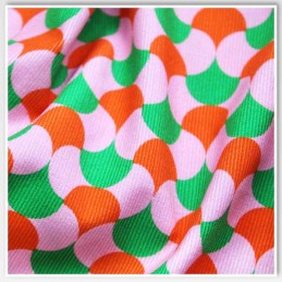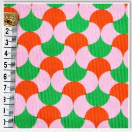 Step back in time with this fabulously funky Retro Geometric Corduroy from Little Johnny. With a vibrant palette of pink, orange, and green, and a mesmerising curved repeat pattern, this design is pure 70s revival. Printed on soft, fine-ribbed 100% cotton corduroy, it's perfect for eye-catching garments, retro accessories, and standout décor. Lightweight and breathable, it’s as practical as it is playful.