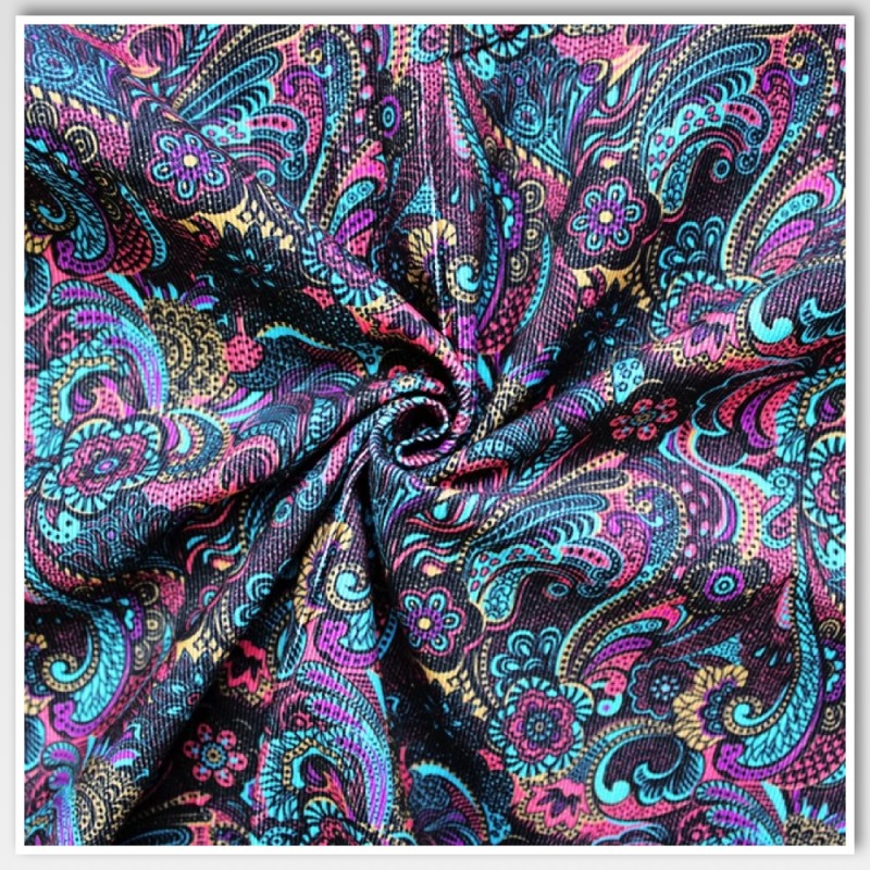 Make a bold statement with this Multicolour Paisley Corduroy from Little Johnny. A swirling kaleidoscope of floral and paisley motifs in vibrant shades of pink, teal, purple, and gold sits against a textured cord base. Soft yet structured, this cotton corduroy is ideal for retro fashion, bohemian-style accessories, and standout home décor. Lightweight and breathable, it combines rich design with comfort and durability.