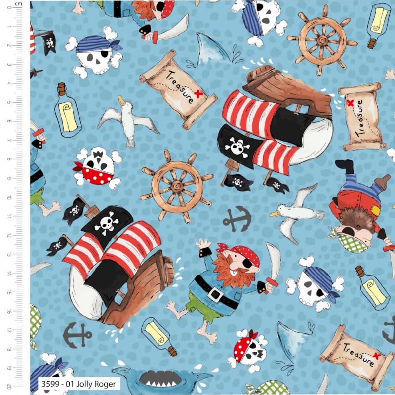 Set sail for adventure with the Jolly Roger fabric from The Craft Cotton Co’s Ship Ahoy range. This playful print is packed with pirate-themed illustrations—cartoony pirates with beards and swords, sharks, treasure maps, anchors, seagulls, bottles with messages, pirate ships, skull and crossbones, waves, and ship’s wheels—all scattered across a light blue background.