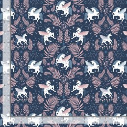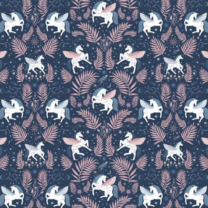 Heavenly Midnight from the Stargazer collection by Dear Stella is a beautifully whimsical fabric featuring elegant white unicorns with pink and blue wings, set against a dark blue sky. The unicorns are framed by crescent moons, scattered stars, and pink floral motifs, creating a soft, magical atmosphere.