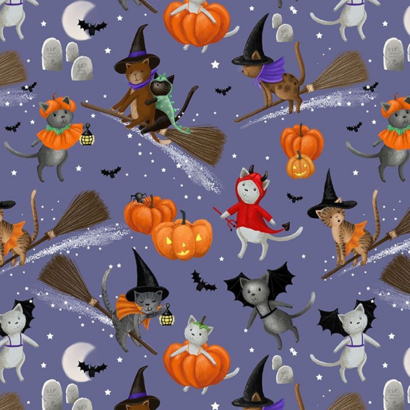 Purranormal Wisteria from the Purranormal collection by Dear Stella is a whimsical Halloween-themed fabric packed with charm and character. A host of adorable cats appear in various costumes — some soaring on broomsticks, others with bat wings or dressed as little devils — all set against a starry purple sky.