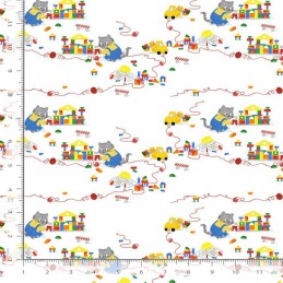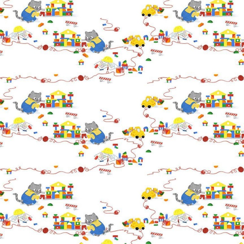 Kitty Blocks from the Cats At Work collection by Leezaworks is a delightful children’s fabric filled with charm and colour. It features cartoon-style cats wearing blue overalls, surrounded by toys and art supplies. Some are building with colourful blocks, others are playing with toy trucks or drawing with crayons — all set against a crisp white background.