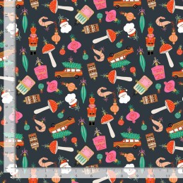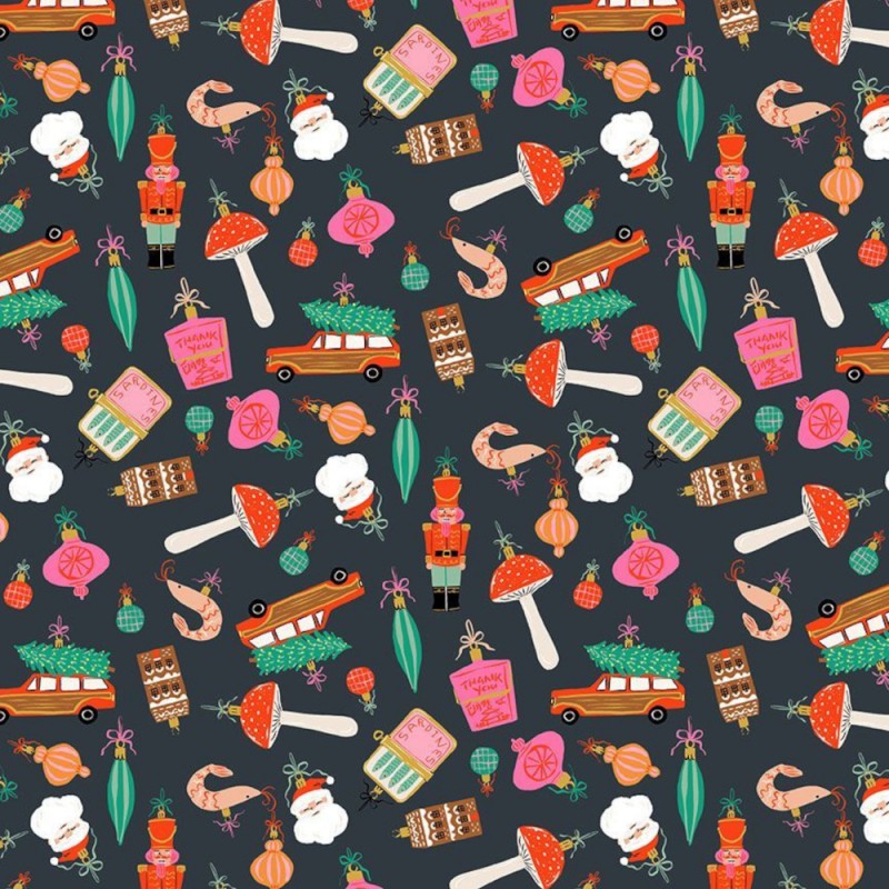“Christmas Ornaments” by Faye Guanipa for Dear Stella’s Holly Jolly collection is a celebration of all things quirky and festive. Set against a rich slate grey background, the design showcases an eclectic mix of ornaments: classic baubles, nutcrackers, gingerbread houses, cars carrying trees, Santa faces, and unexpected additions like prawns, sardine tins, and mushrooms — all illustrated in Faye’s signature playful style.