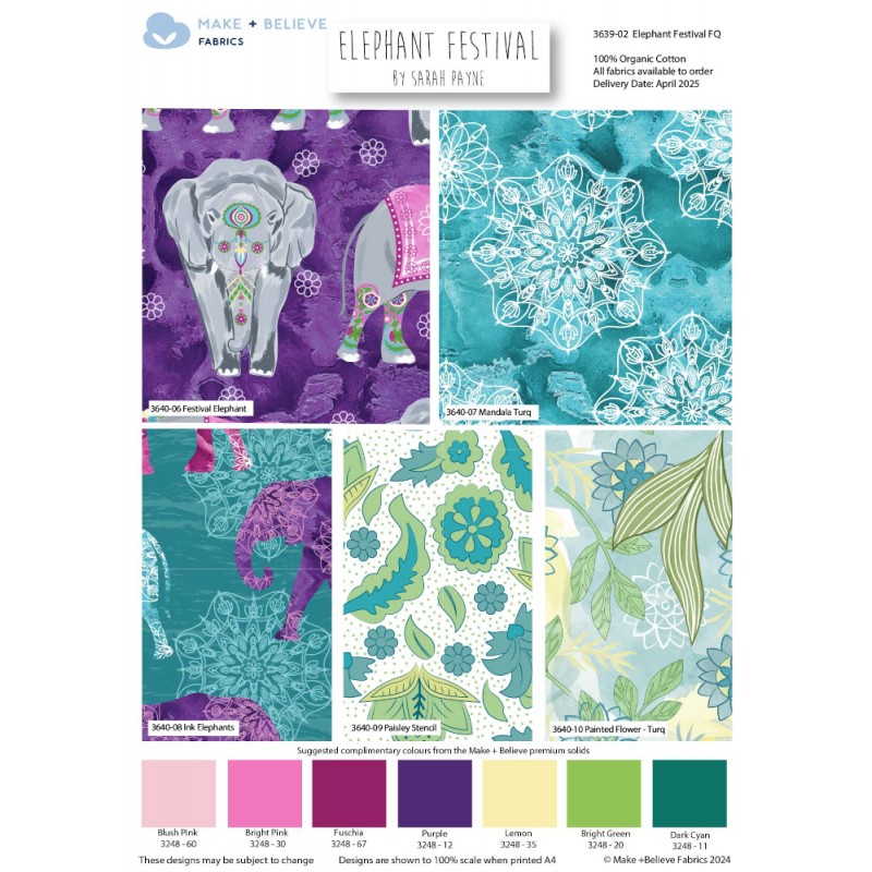 The Mandala Purple Fat Quarter Bundle from Make + Believe offers a dynamic selection of five fat quarters from the richly patterned Elephant Festival collection. Featuring a blend of elephants, mandalas, paisleys, and painterly florals in purple, turquoise and multicolour tones, it’s ideal for fun, expressive craft and sewing projects.