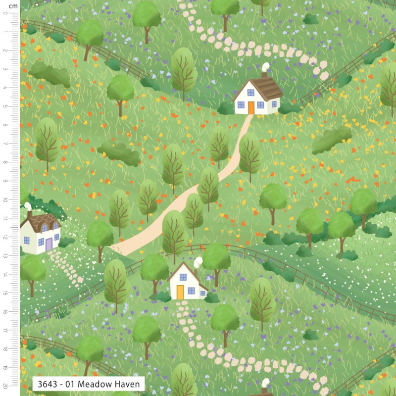 Meadow Haven is a charming fabric from the Cottage Bliss collection by Make + Believe, designed by Alexandra Holt. This fabric captures the peaceful beauty of rural life with its illustrated meadow scene featuring quaint cottages, winding stone paths, leafy trees, and a colourful array of flowers. The vibrant tones of green, yellow, orange and blue bring this tranquil countryside setting to life.