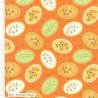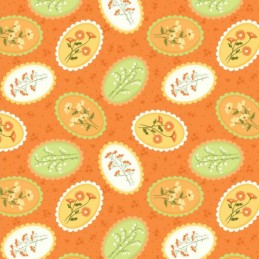 Golden Stamps is a bold and cheerful design from the Cottage Bliss collection by Make + Believe, designed by Alexandra Holt. This fabric features a vibrant orange background scattered with delicate floral silhouettes. The standout feature is a series of oval-shaped stamp motifs, each showcasing different flowers with softly contrasting coloured backings.