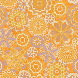 Sunshine Crochet is a charming, handcrafted-style print from the Cottage Bliss collection by Make + Believe. This design features delicate lace doilies in shades of yellow, white, and pastel blue, arranged in an overlapping pattern against a vibrant orange background. The intricate detailing and cheerful palette make it a standout for cottage-inspired and vintage-themed projects.