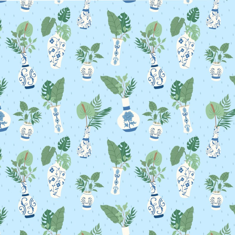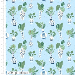 Tropic Vase is a stylish botanical print from the Botanical Garden collection by Kimberly Hind for The Craft Cotton Co. It features elegant white vases with detailed blue patterns filled with a variety of tropical green leafy plants, all set on a soft light blue background for a calm and refreshing aesthetic.