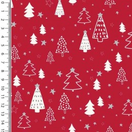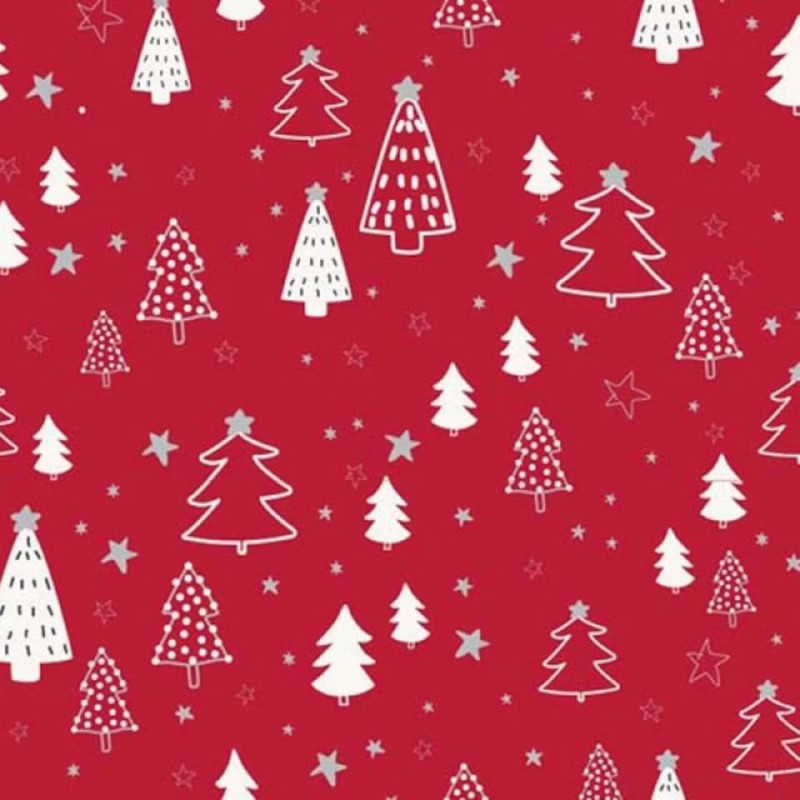 Festive Trees is a cheerful cotton poplin fabric featuring whimsical, hand-drawn-style Christmas trees and star motifs scattered across the surface.