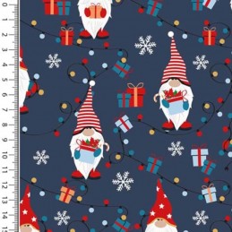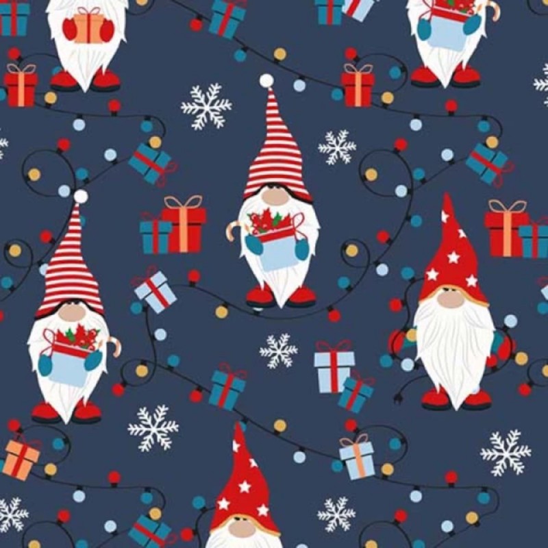 Festive Gnomes is a playful Christmas fabric featuring rows of cheerful gonk-style gnomes in festive hats, holding presents or Christmas lights. The design is interspersed with scattered snowflakes, gift boxes, and string lights, creating a lively, seasonal feel.