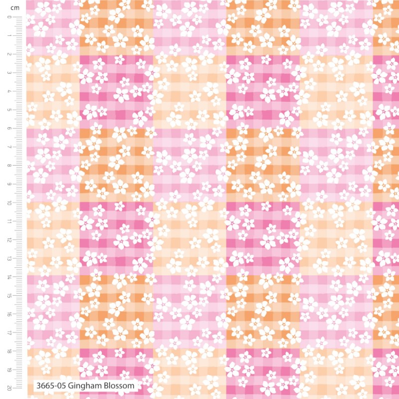 Gingham Blossom, from the Sweet Blooms collection by Make + Believe and designed by The Crafty Pie, blends classic checks with a fresh floral twist. Alternating orange and pink gingham squares are overlaid with pretty white flowers, giving the fabric a cheerful and retro-inspired look.