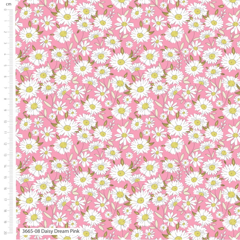 Daisy Dream Pink is part of the Sweet Blooms collection from Make + Believe, created by designer The Crafty Pie. It is a lively floral print full of charm, with white daisies and fresh green leaves scattered across a bright pnk background, creating a vibrant and uplifting design.