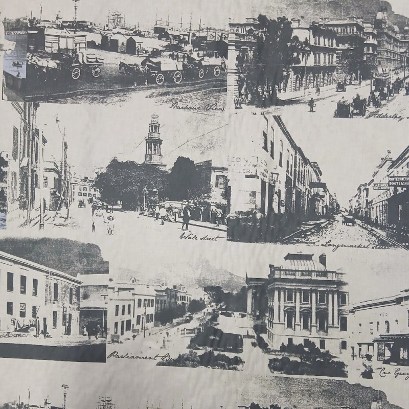 This 100% cotton lifestyle print fabric features a nostalgic collage of early 20th-century street scenes, created from black-and-white photographic-style imagery. The design captures classic urban life, with historic streets, traditional architecture and period details that give the fabric a strong vintage feel.
