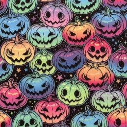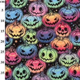 Bring your creations to life with this fun and vibrant Halloween Pumpkin Polycotton Fabric, featuring colourful smiling and spooky pumpkin faces scattered across the design.