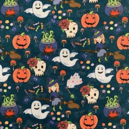Bring your Halloween creations to life with this Halloween Witch & Pumpkin Polycotton Fabric, featuring a fun mix of witches, pumpkins, ghosts, skulls, and magical elements.