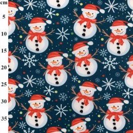 Add a cheerful touch to your seasonal makes with this Christmas Snowman Polycotton Fabric, featuring smiling snowmen surrounded by delicate snowflakes.