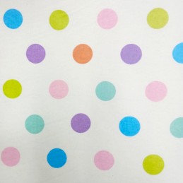 This 100% cotton printed Winceyette fabric from R.E.D Textiles features a cheerful design of rainbow-coloured polka dots arranged in a subtle, repeating pattern.
