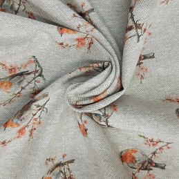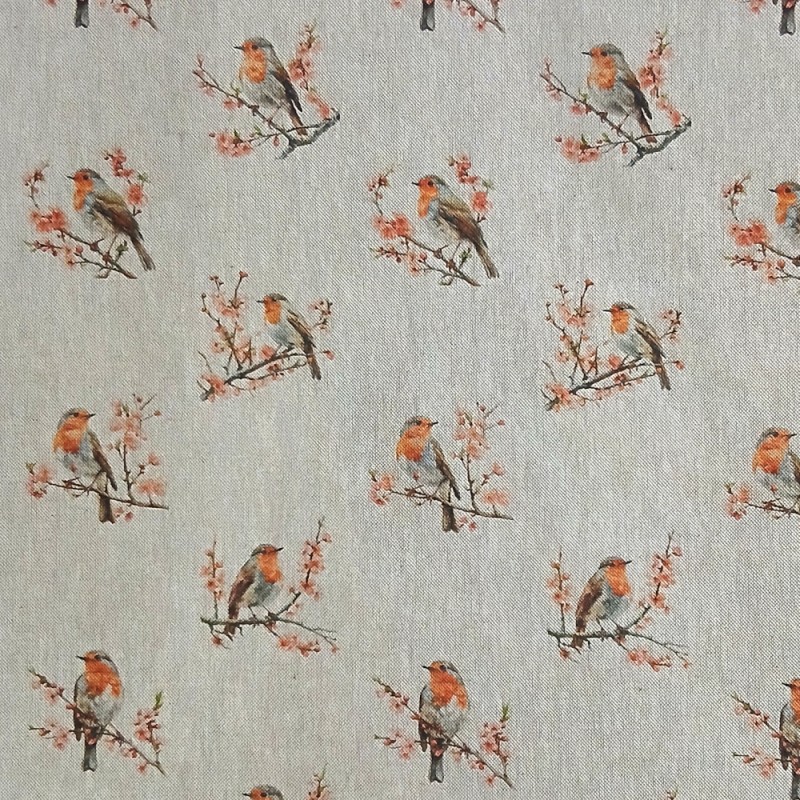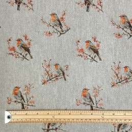 Cotton Rich Linen Look Fabric Digital Red Robins Birds Allover 140cm Wide