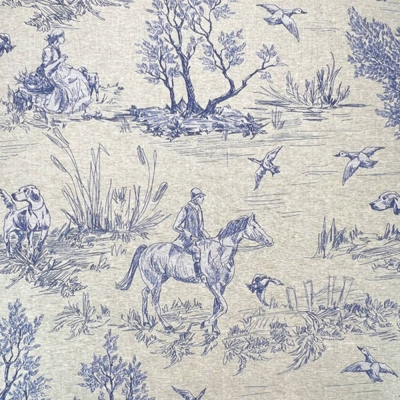 Country Toile is a timeless cotton-rich linen look fabric featuring a traditional countryside scene. The design includes a hunter on horseback, accompanied by dogs and ducks, all illustrated in a classic toile style.