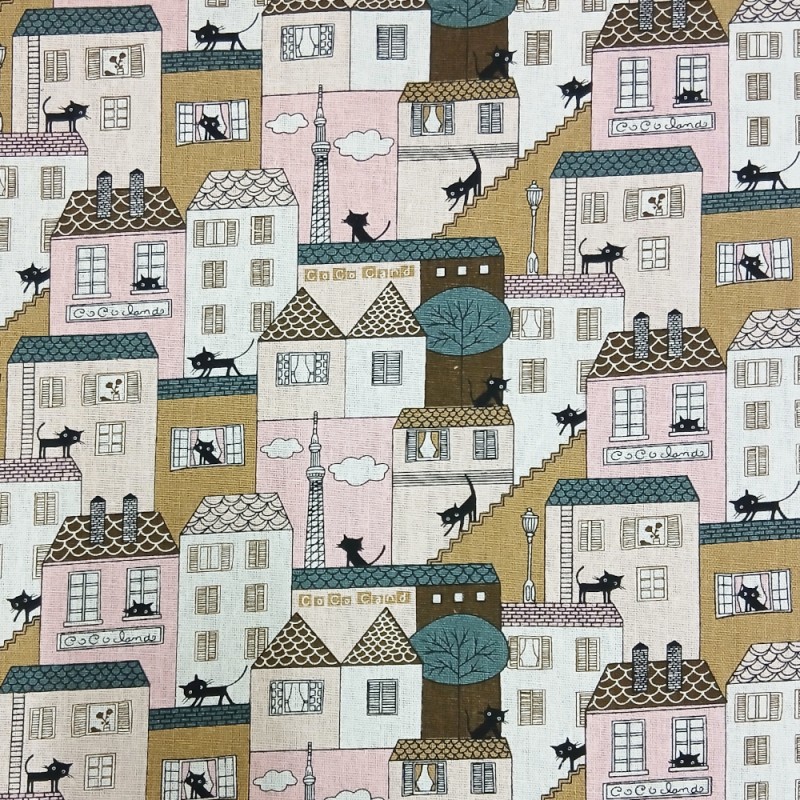 This whimsical cotton linen fabric features a charming illustrated townscape filled with layered houses, winding staircases and curious black cats dotted across rooftops, windows and steps. The design feels storybook-like and playful, with plenty to discover the more you look.