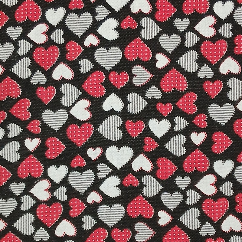 This SALE heart print cotton canvas fabric features a bold and playful all-over heart design in red, white and striped detailing, set against a contrasting black background. The repeating pattern gives it a fun, modern look while remaining versatile for a wide range of sewing projects.