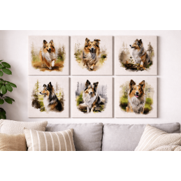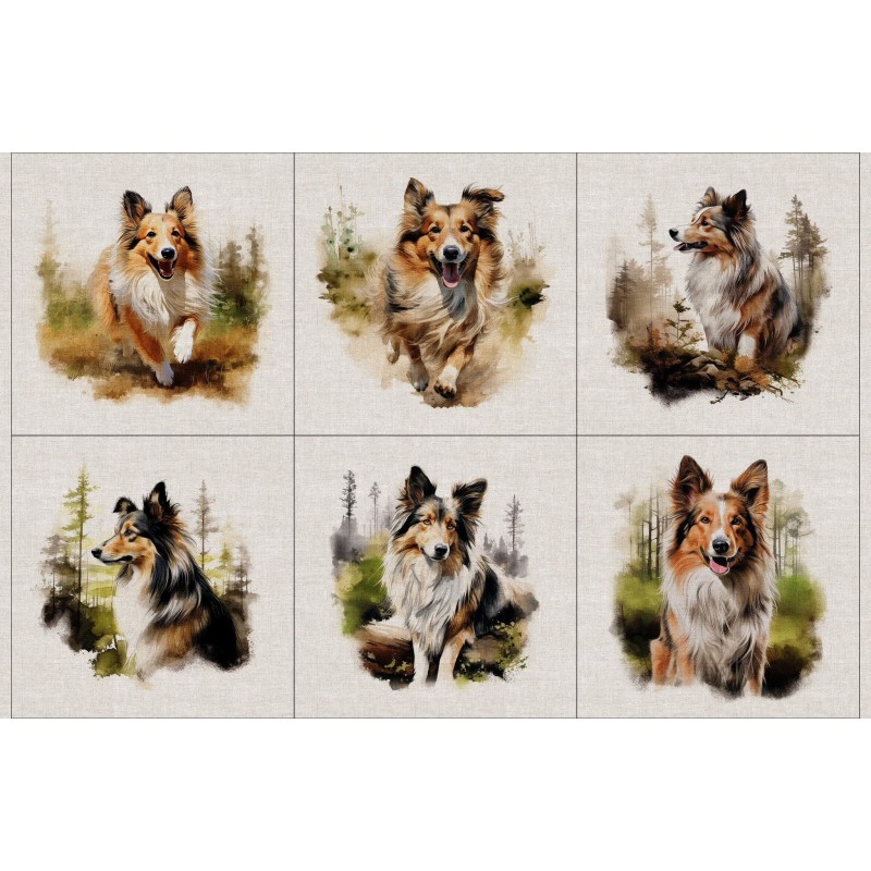 Celebrate the beauty of the Shetland Sheepdog with this stunning digitally printed panel fabric. Featuring six detailed Sheltie illustrations in natural woodland settings, this design captures the elegance, intelligence and charm of this much-loved breed.