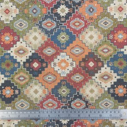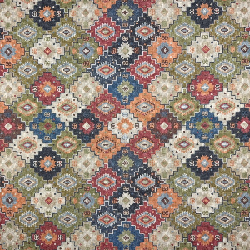 Make a bold statement with this Antalya Geometric Cotton Rich Linen Look Fabric from the Digital Crafty Linens collection. Featuring a striking multi-coloured geometric design inspired by traditional patterns, this fabric blends rich tones and intricate shapes to create a lively and eye-catching look.